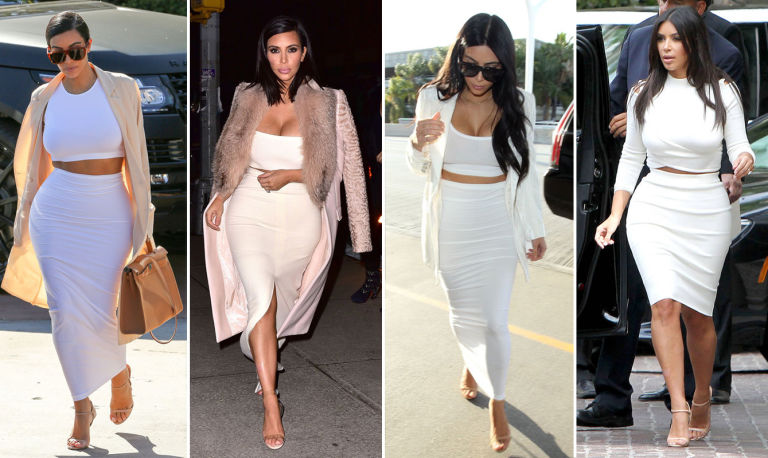 1) White crop top with matching pencil skirt and minimalist neutral sandals.