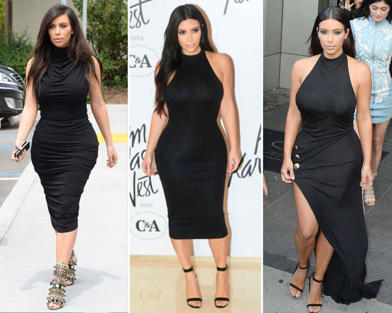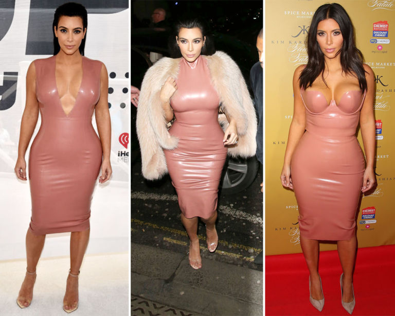 3) Flesh-colored, knee-length, latex bodycon dress.