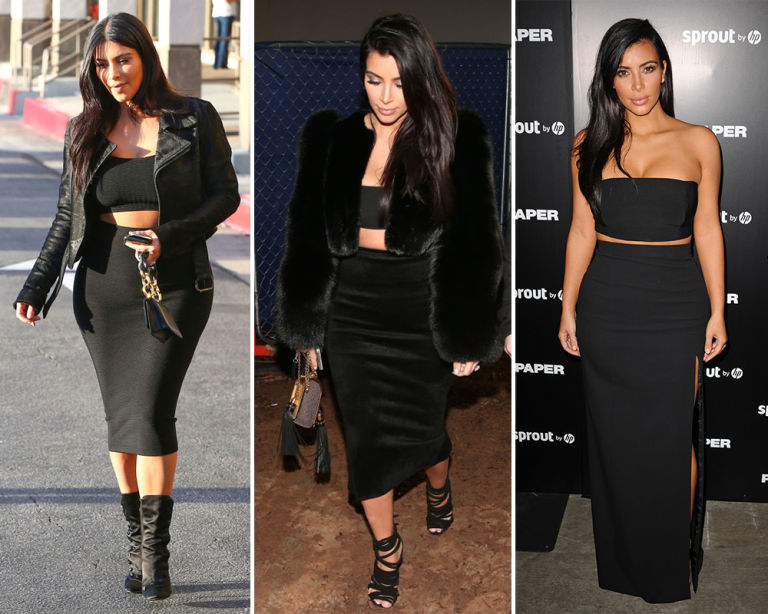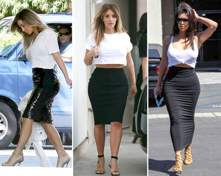 5) Cropped white T-shirt and black pencil skirt.