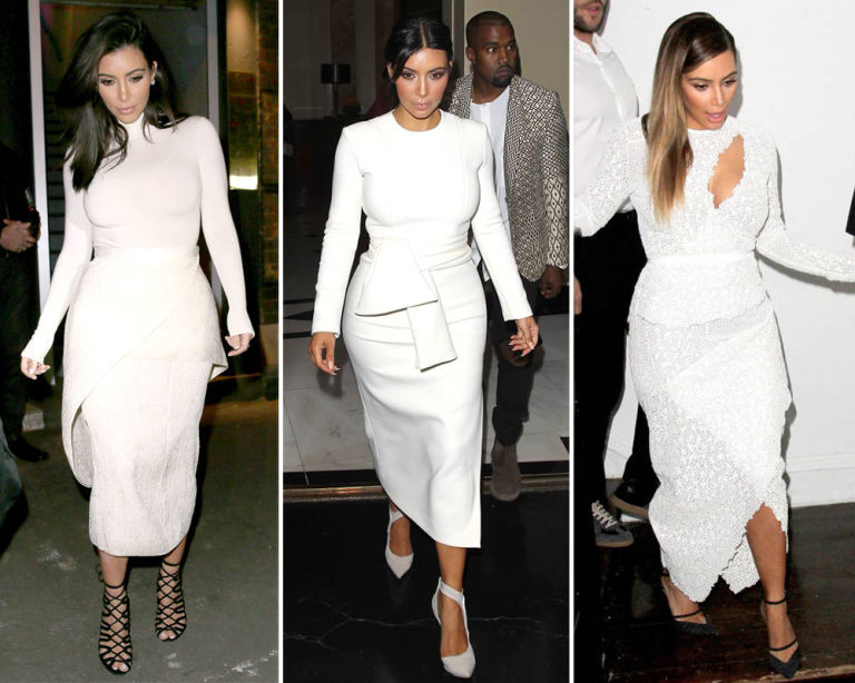 9) White long-sleeved midi with wrap detail around the waist and hips.