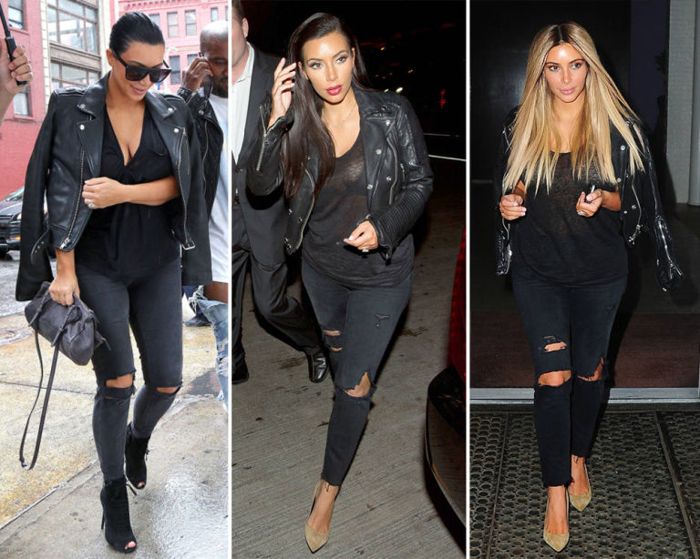 10) Ripped black jeans, black T-shirt, and black leather moto jacket.