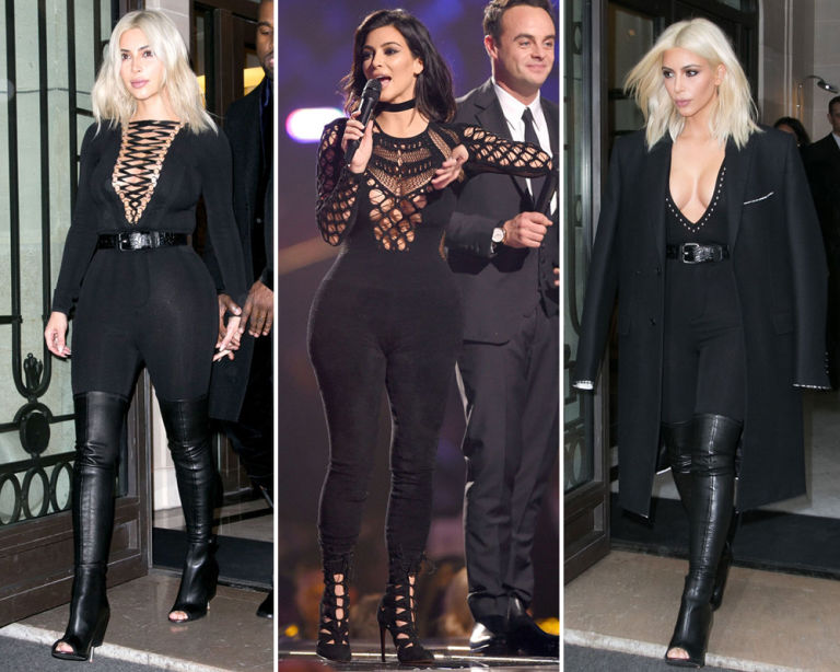 15) Black catsuit with plunging neckline.